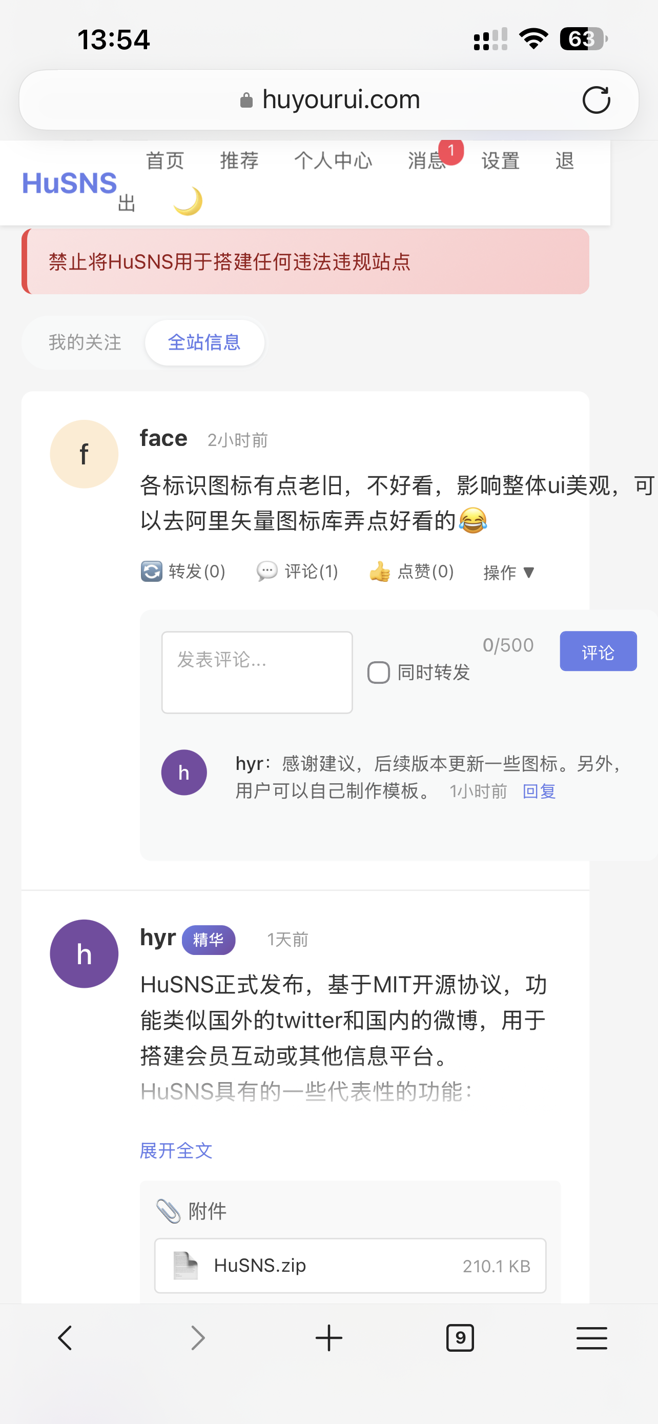 最新的源码修复了附件无法下载的bug,可以下载覆盖。HuSNS对数据库的所有操作(包括升级)都是在用户无感的情况下完成的,不需要用户手动操作数据库。